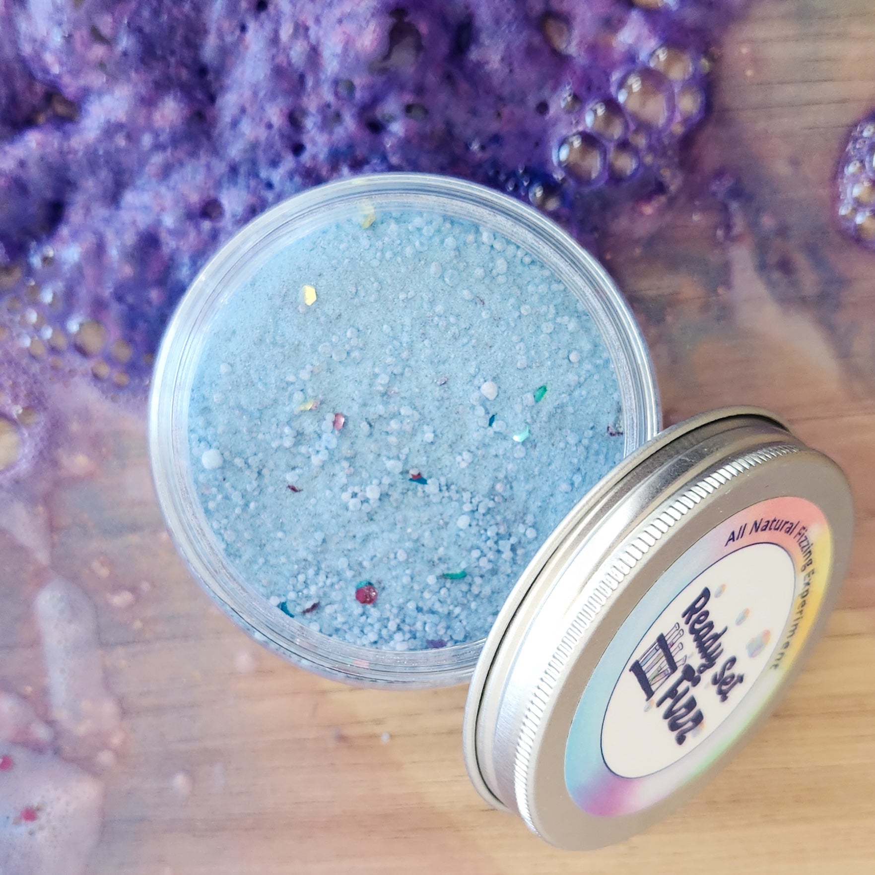The purple colour changing fizz will change to purple. This fizz has a beautiful shimmering and sparkle to it. It is gorgeous to play with long after the bubbles have popped. Made using natural ingredients.